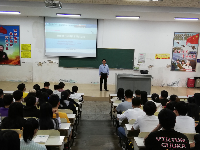 曾名湧教授主要介绍了(1)我国牡蛎资源状况、国内外牡蛎加工现状、牡蛎壳利用技术进展、牡蛎蛋白利用技术进展以及牡蛎活性肽研究进展;(2)其课题组在牡蛎加工方面所做的研究工作,包括牡蛎壳和牡蛎软体(肉)的产品开发、牡蛎组分中蛋白活性肽和多糖的功能性进研究,并介绍了下一步将在牡蛎多糖和牡蛎加工制品的内源性安全危害因子方面进行深入研究;(3)目前牡蛎研究及牡蛎加工产业遇到的瓶颈,对牡蛎的发展前景进行了预测。同学们认真听取了曾教授的精彩报告,课堂氛围活跃,取得了良好的效果,老师们和同学们均受益匪浅。报告结束时,同学们对曾教授的精彩讲授报以热烈的掌声,授课取得圆满成功。