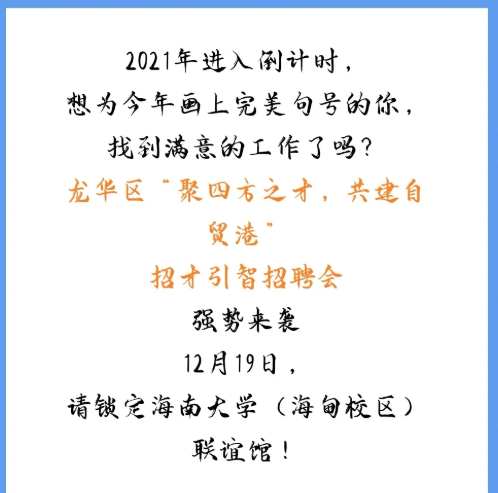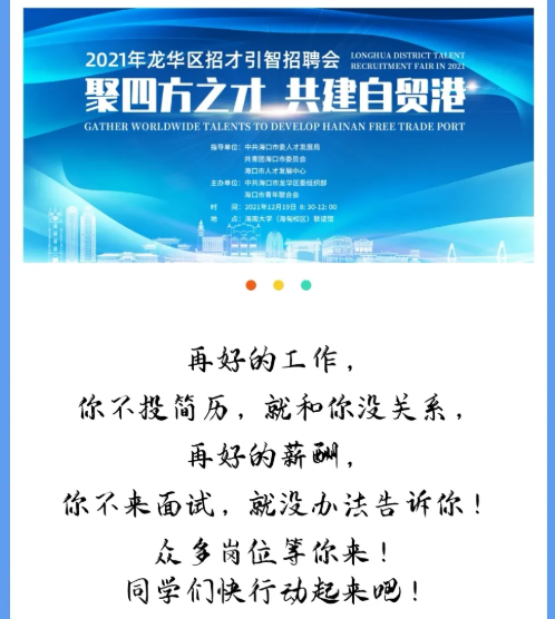 海口市龙华区2021年招才引智招聘会(bv伟德国际1946专场)定于12月19日(本周日)上午08:30-12:00在联谊馆举行,此次参会单位包含了外国政府驻华机构、国企、民营企业等36家用人单位单位,提供的岗位年薪均在6万以上,请大家积极参加!