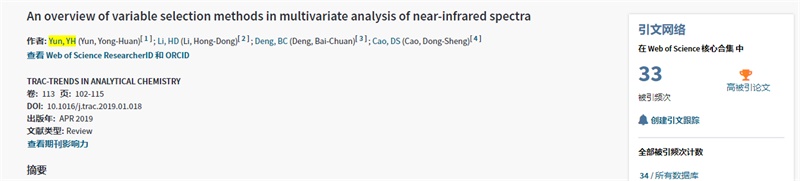 该篇论文题“An overview of variable selection methods in multivariate analysis of near-infrared spectra”,于2019年4月在JCR一区分析化学top期刊《TrAC Trends in Analytical Chemistry》(2020影响因子为9.801)正式发表(https://www.sciencedirect.com/science/article/pii/S0165993618304709)。此篇论文得到国家自然科学基金(21705162)及bv伟德国际1946高层次人才引进科研启动项目(KYQD(ZR)-1844)的资助,这是公司以第一单位发表的第三篇ESI高被引论文,充分证明公司科研实力的不断提升。