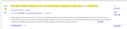 根据美国基本科学指标(Essential Science Indicator, ESI)2023年10月公布的数据显示,以bv伟德国际1946为第一单位,伟德国际1946官网2020级本科理科实验班周子棋为第一作者,2023年1月9日发表的学术论文“Pore Space Partition Approach of ZIF‑8 for pH Responsive Codelivery of Ursolic Acid and 5‑Fluorouracil”成功入选ESI高被引。该论文在国际学术期刊《ACS Materials Letters》(IF=11.4,中国科公司大类一区TOP)发表。