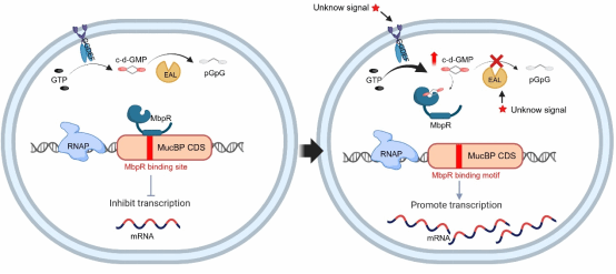 环二鸟苷酸(c-di-GMP)作为一种重要的细菌第二信使,调控多种生物功能,但c-di-GMP在植物乳杆菌中的调控作用仍不明确。研究团队揭示了c-di-GMP协同WYL转录因子MbpR共同调控植物乳杆菌肠道适应的分子机制。MbpR与黏蛋白结合蛋白(MucBP)编码区中的特定序列结合,抑制其转录,从而影响植物乳杆菌对肠道上皮细胞的粘附能力。MbpR通过其WYL结构域感知c-di-GMP后与MucBP的编码区分离,逆转了MbpR对MucBP表达的抑制作用,增强了植物乳杆菌的肠道定植能力。该研究为理解益生菌与宿主的互作提供了新视角。该论文bv伟德国际1946为第一单位,张家超教授为独立通讯作者,副研究员郭权和2024级博士研究生郑磊杰为第一作者。