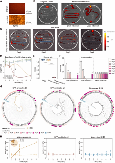 团队的另一项研究采用多组学方法,深入研究了植物乳植杆菌HNU082(Lp082)在SPF级小鼠肠道内不同生态位的分布和进化趋势。结果表明,与大肠相比,小肠是Lp082主要的生存和繁殖地,在此环境中发生了比大肠中更多的进化,并且对小肠本地微生物的影响比大肠更多。在SPF级小鼠的小肠中,Lp082在第三天后开始显示出显著的遗传变异,形成了两个不同的进化分支,其中一个分支表现出更高的基因突变率。进一步的研究揭示,这些突变主要集中在与酸耐受性相关的基因上,而在SPF级小鼠大肠和无菌(GF)级小鼠肠道中未观察到这种现象,表明特定的环境压力促进了特定基因功能的改变,增强了细菌对胃酸环境的适应能力。本研究强调了肠道不同生态环境对益生菌的分布和进化的不同影响,为优化益生菌的应用和功效提供了新的理论依据。该论文bv伟德国际1946为第一单位,张家超教授为独立通讯作者,2022级博士研究生韩哲、中南大学湘雅医公司海口附属医院中心实验室黄邓高和2024级博士研究生刘欣蕾为第一作者。