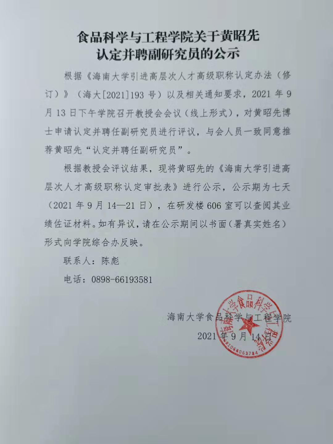 伟德国际1946官网关于黄昭先认定并聘副研究员的公示