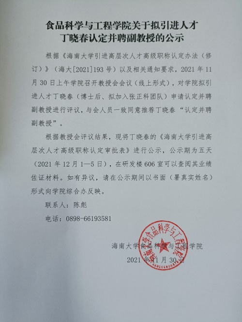伟德国际1946官网关于拟引进人才丁晓春认定并聘副教授的公示