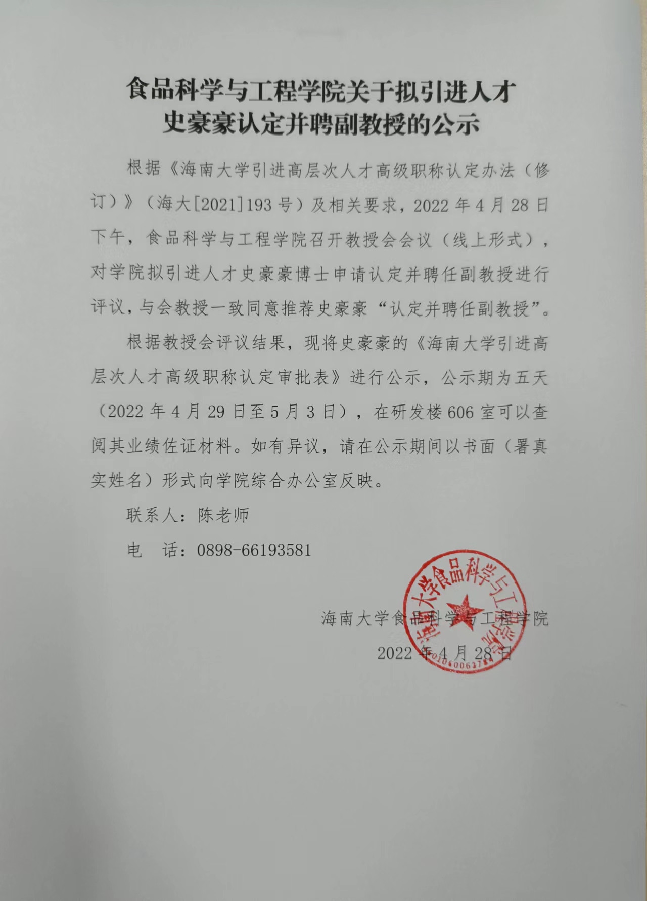 伟德国际1946官网关于拟引进人才史豪豪认定并聘副教授公示