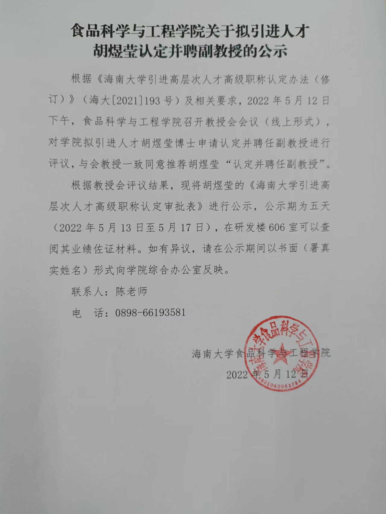 伟德国际1946官网关于拟引进人才胡煜莹认定并聘副教授的公示