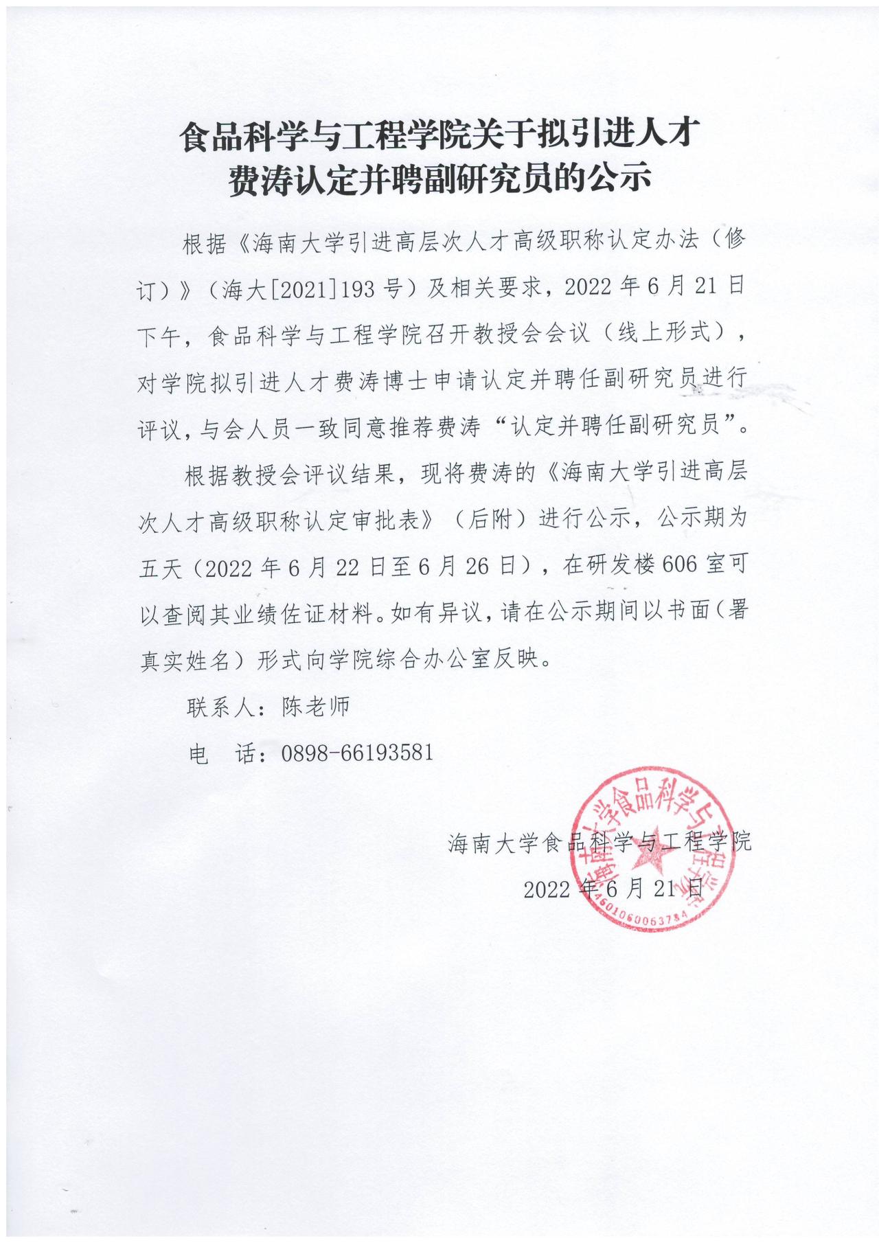 伟德国际1946官网关于拟引进人才费涛认定并聘副研究员公示