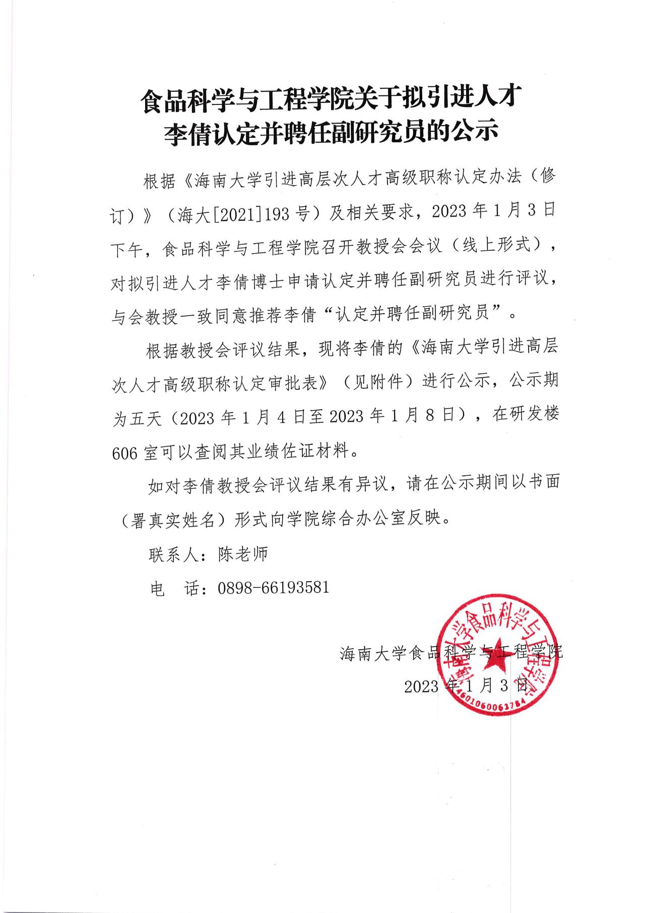 伟德国际1946官网关于拟引进人才李倩认定并聘副研究员公示