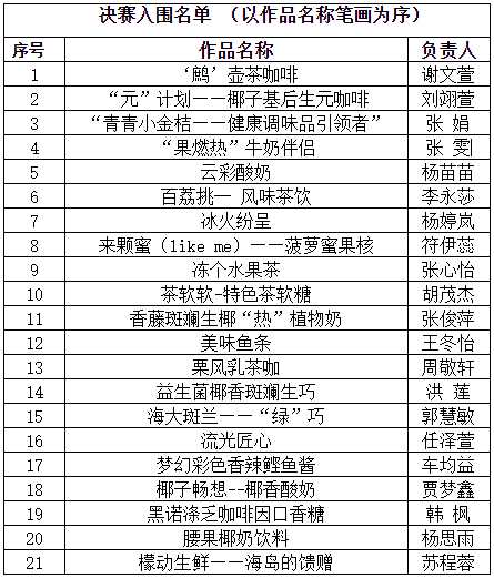 根据《bv伟德国际1946第一届“热作杯”食品创新大赛方案》要求,经个人申报、资格审查、专家评委逐一评选,现将入围决赛的作品名单进行公示,公示时间2023年9月25日至9月30日。